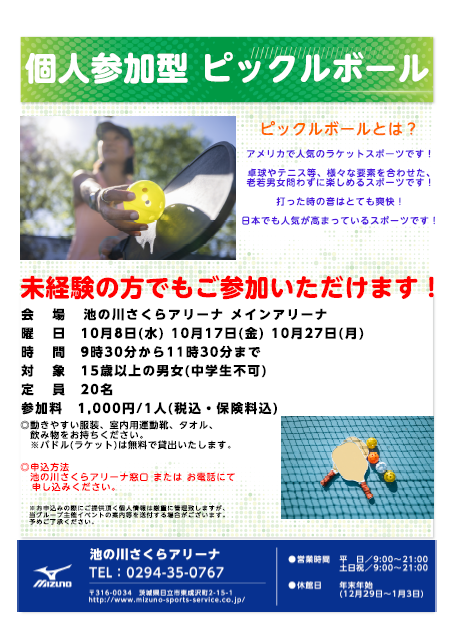 - 池の川さくらアリーナ窓口 または お電話にて、お申し込みください。